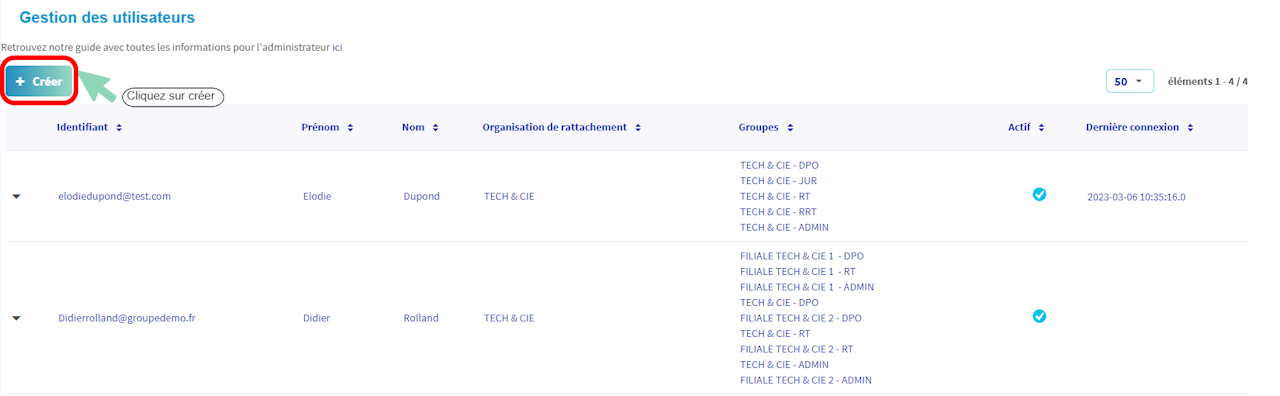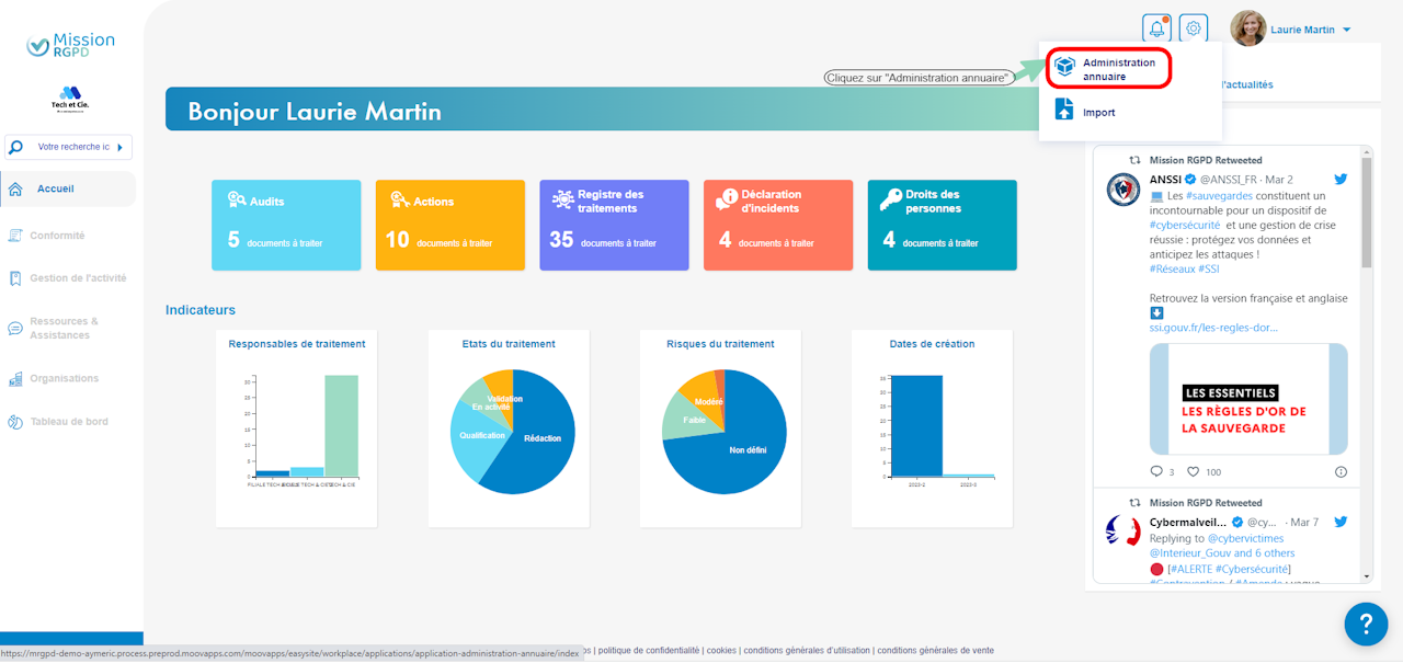 To create a user on one or multiple organizations, you need to have the 'Admin' role on the Mission RGPD platform. Then, go to the 'Directory Administration' tab, which you can find on the left side of your user profile (next to the gear icon).