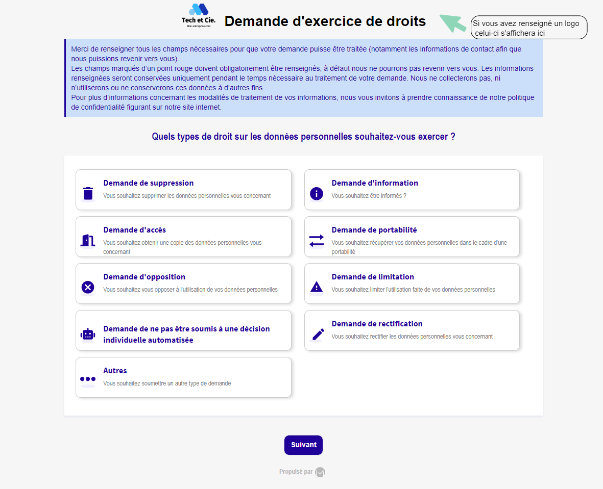 Vous pouvez, si vous le souhaitez, mettre à disposition des personnes concernées (clients, prospects, collaborateurs,...) un formulaire accessible en ligne afin de formaliser des demandes d’exercice de droits.