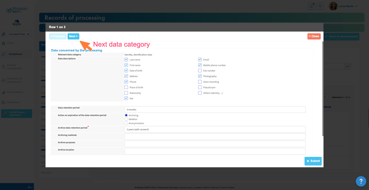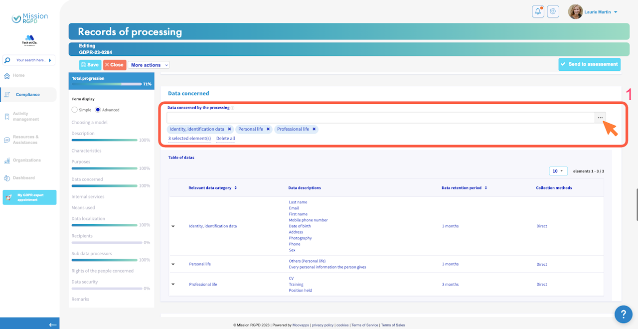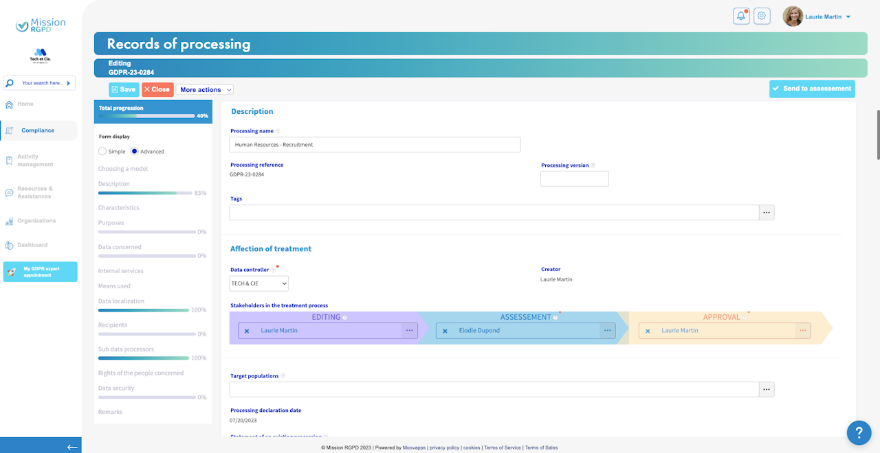 Mission RGPD guides you through the declaration of your processing activities using a form to be filled out.