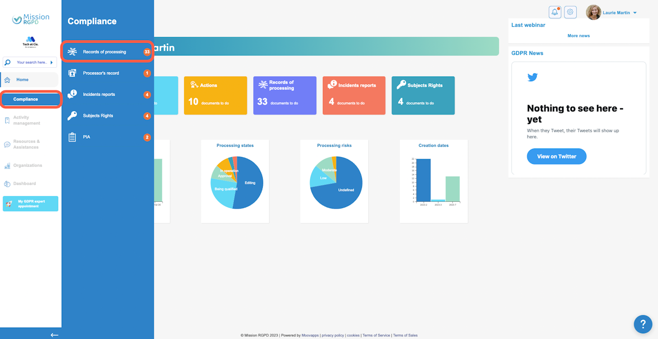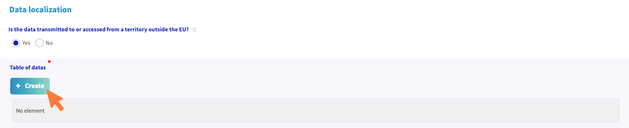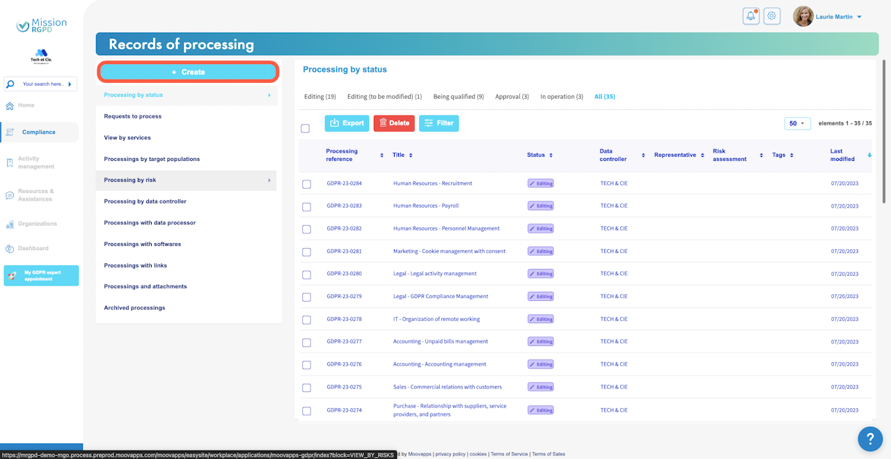 To create a new processing activity directly in Mission RGPD, click on the Create button from the list of processes (Compliance Menu > Records of processing).