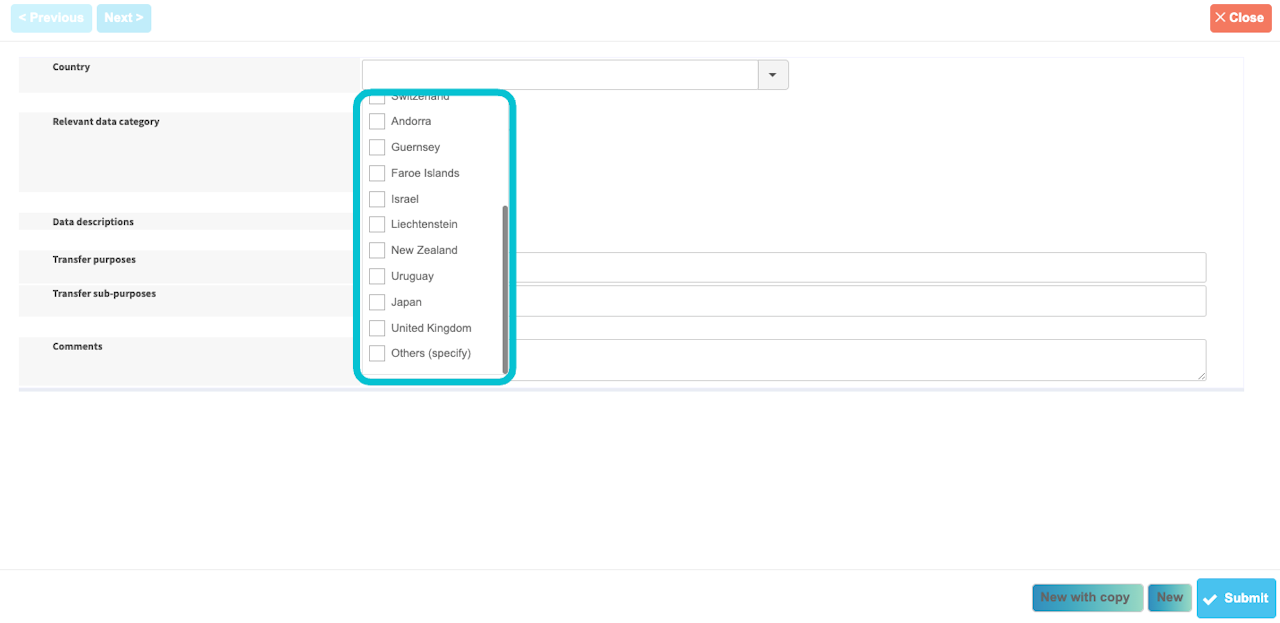 The country where you transfer data isn't on the list, select "Other (specify)": you need to find which appropriate safeguards applies.