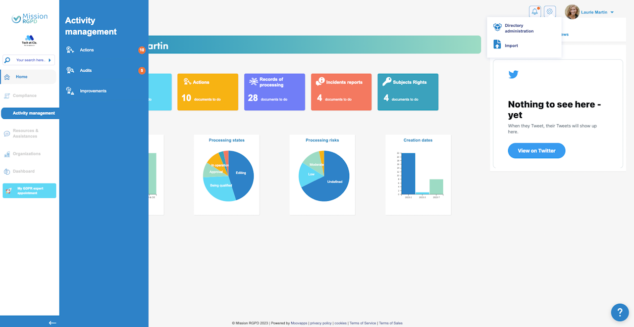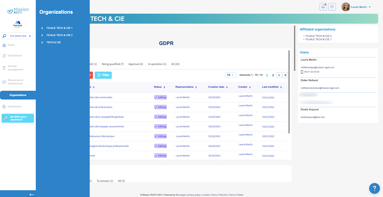 The platform allows you to manage the compliance of multiple entities within a centralized interface. Access to one of your organizations and see only its records of processing, actions, audits, etc.